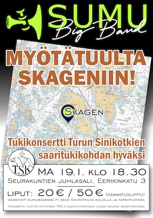 SUMU Big Band ja Turun Sinikotkat järjestävät yhdessä tukikonsertin Sinikotkien saaritukikohdan hyväksi. SUMU Big Band esittää hyväntuulista big band -musiikkia lähes kaikista ilmansuunnista eri puolilta karttapalloa!